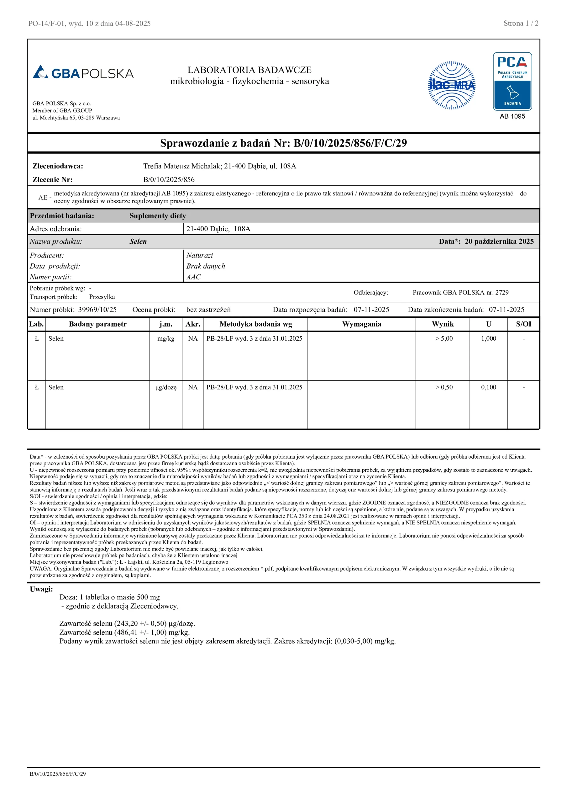 Systematycznie rozszerzamy zakres prowadzonych analiz oraz nawiązujemy współpracę z kolejnymi laboratoriami w całej Polsce. Naszym celem jest, aby każda partia produktów Naturazi posiadała potwierdzoną przez akredytowane laboratoria zawartość substancji aktywnych oraz czystość.